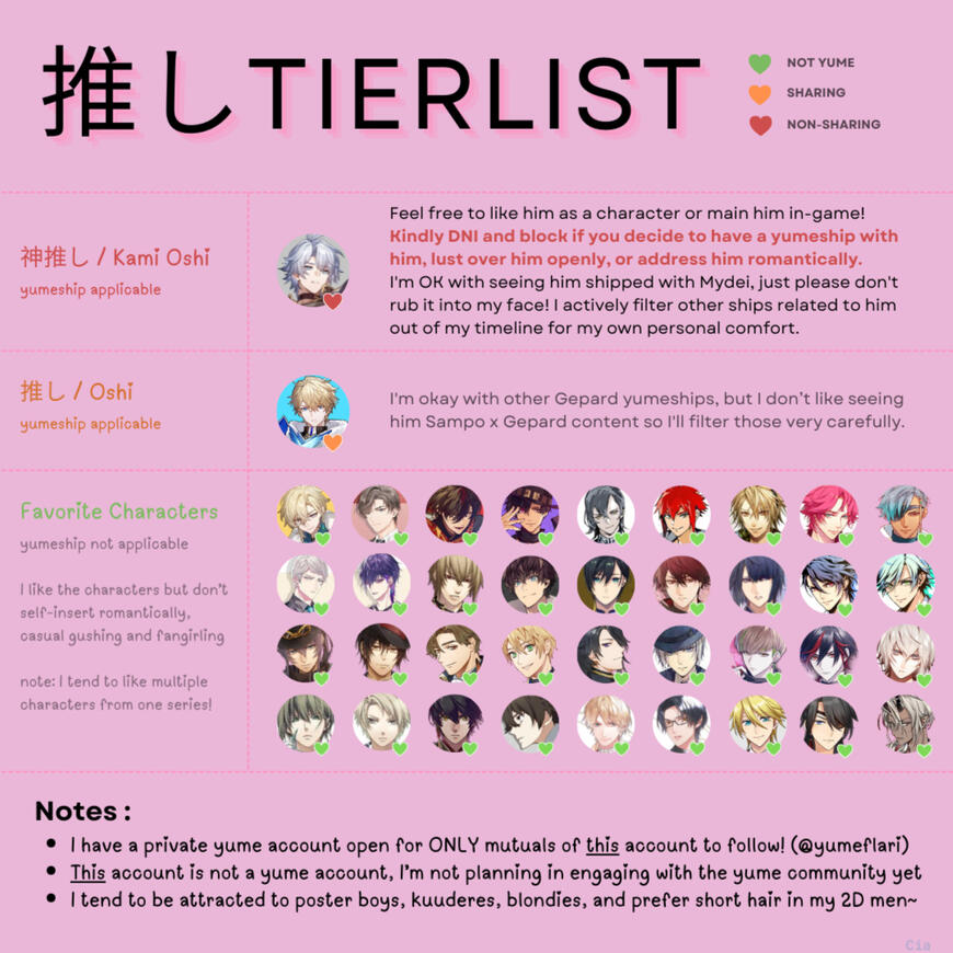I won't play games if I'm not fond of the artstyle!✖ㅤ𝐍𝐆: I do not enjoy LI x LI (BL) shipping for otome.ㅤ✖